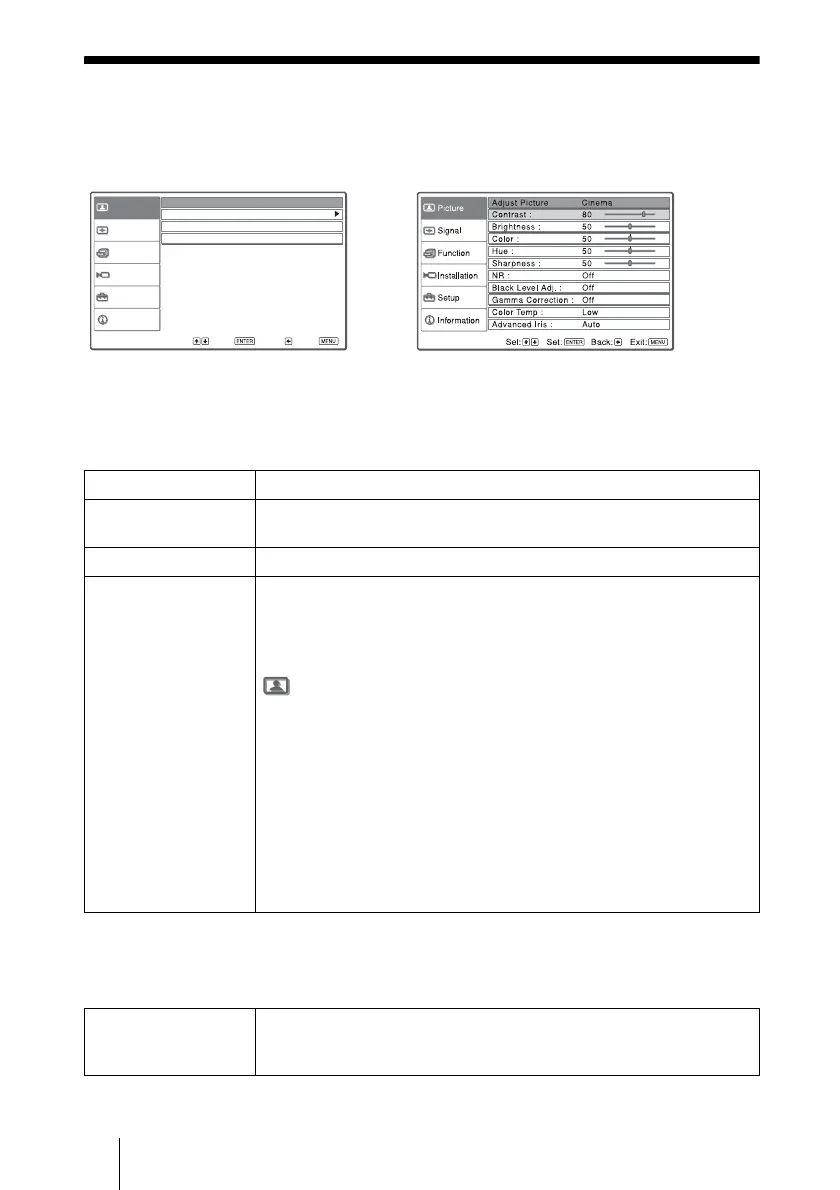 The Picture menu is used for adjusting the picture.