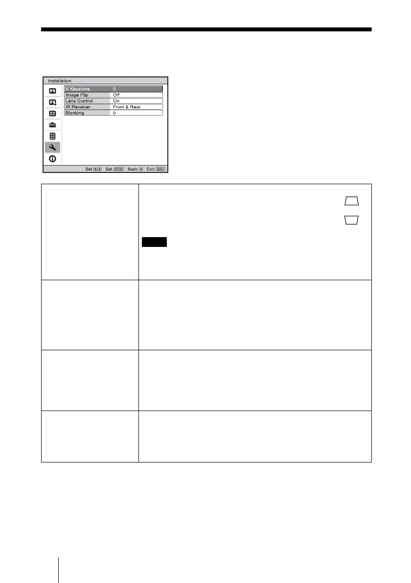 V Keystone Corrects the vertical trapezoidal distortion of the picture.