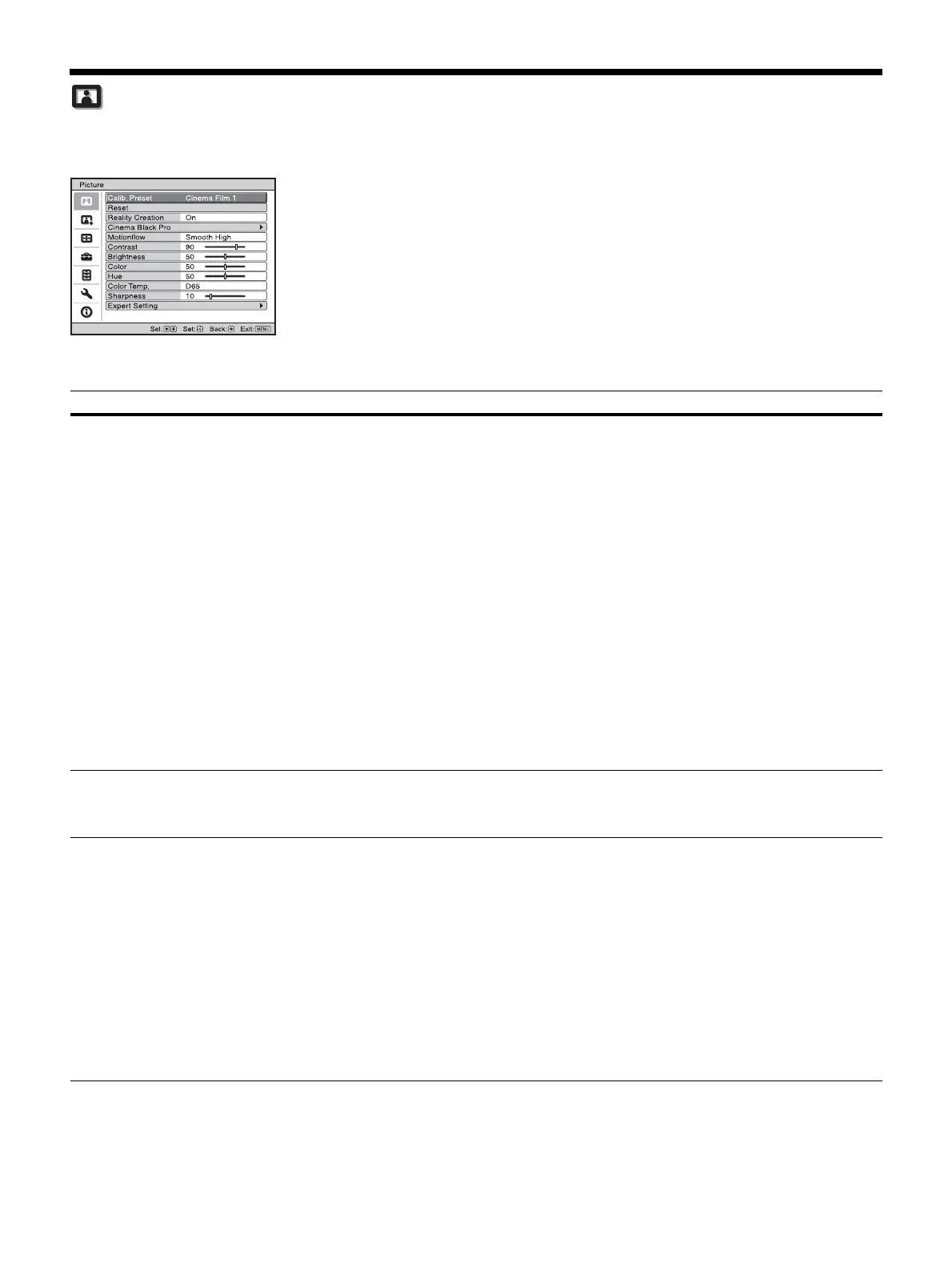 The Picture menu is used for adjusting the picture.