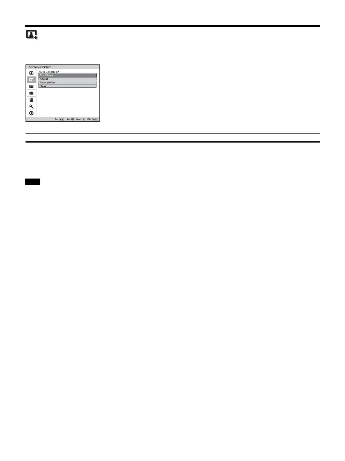 Auto Calibration Pre Check: Checks the color difference against the factory default settings, before calibration starts.
