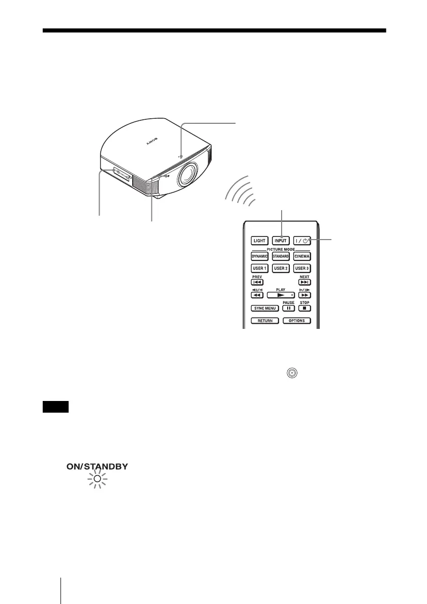 ?/1 (ON/STANDBY), INPUT, LENS, MENU, and M/m/</,/ (joystick) buttons on the