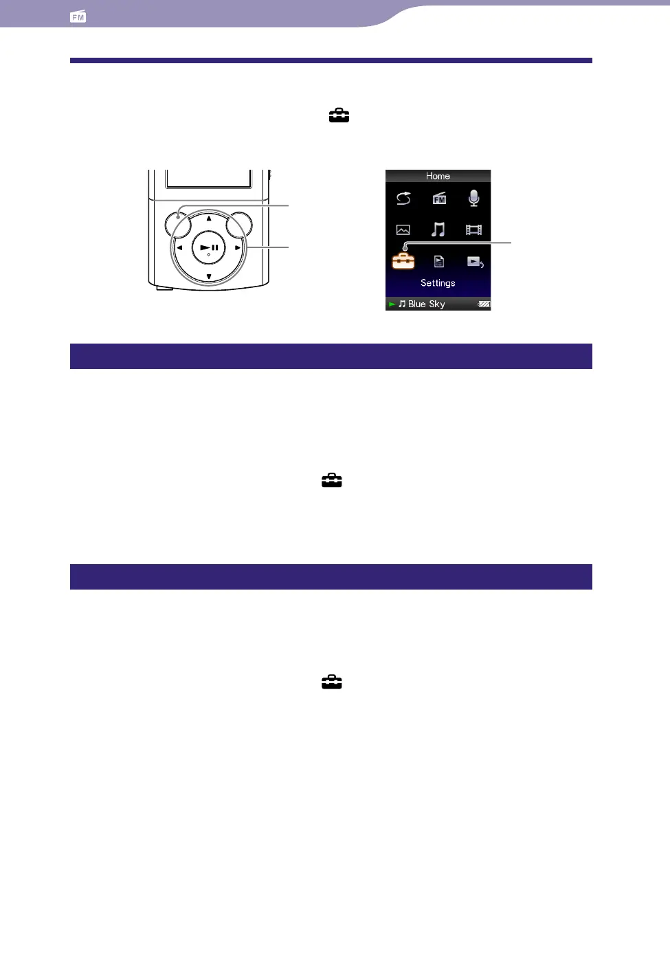 To change the FM radio settings, select [Settings] from the [Home] menu,