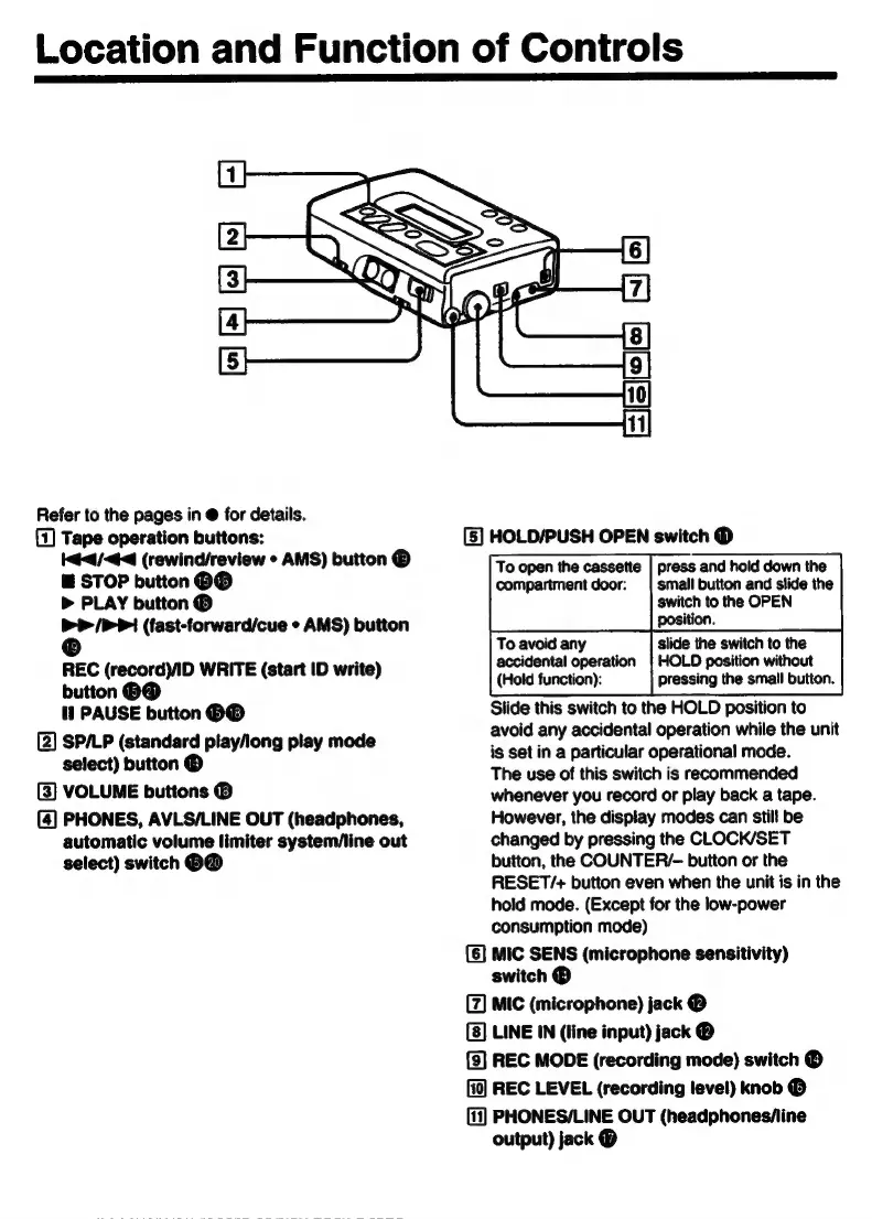 Sony Walkman TCD-D7 - Location and Function of Controls; Tape Operation Buttons; SP;LP Mode Selection; Volume Control Buttons