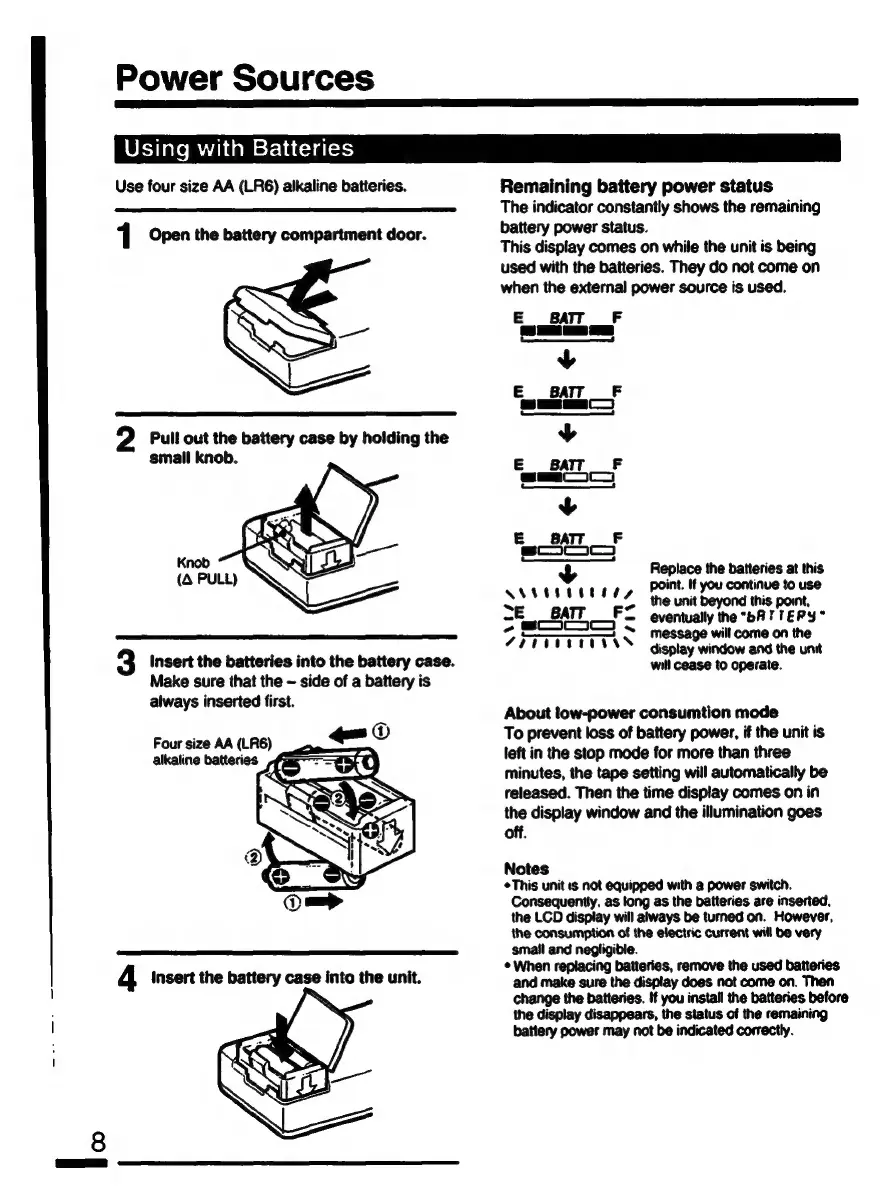 Sony Walkman TCD-D7 - Power Sources; Battery Installation and Usage; Battery Power Status Display; Low-Power Consumption Mode