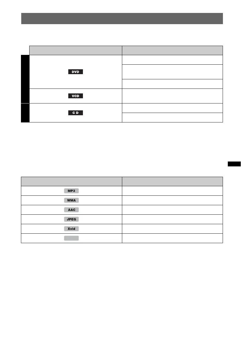 The following chart helps you to check if a disc is supported by this unit, as well as what functions are