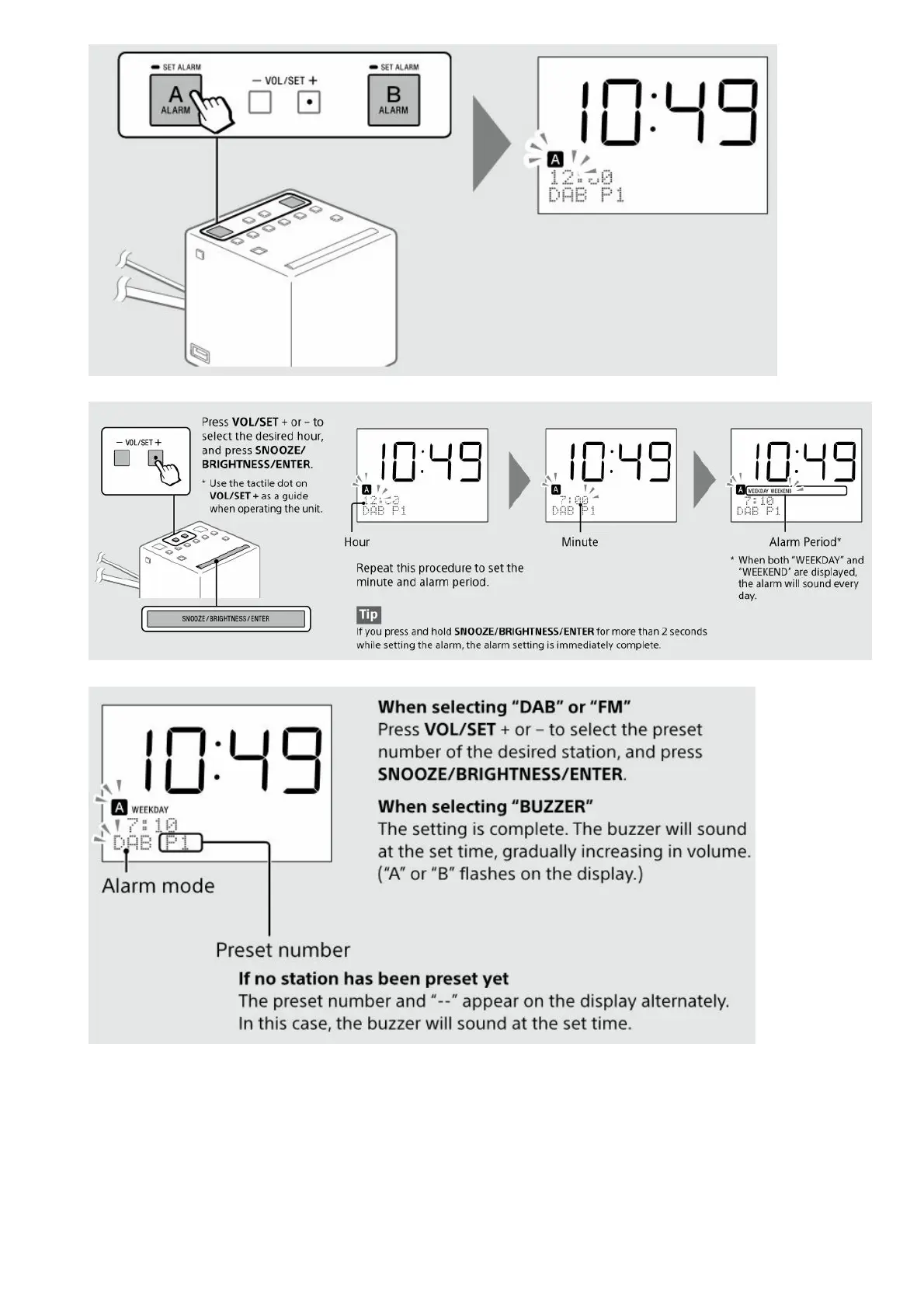 Sony XDR-C1DBP - Set Alarm Time and Period; Select Alarm Mode; Adjust Alarm Volume