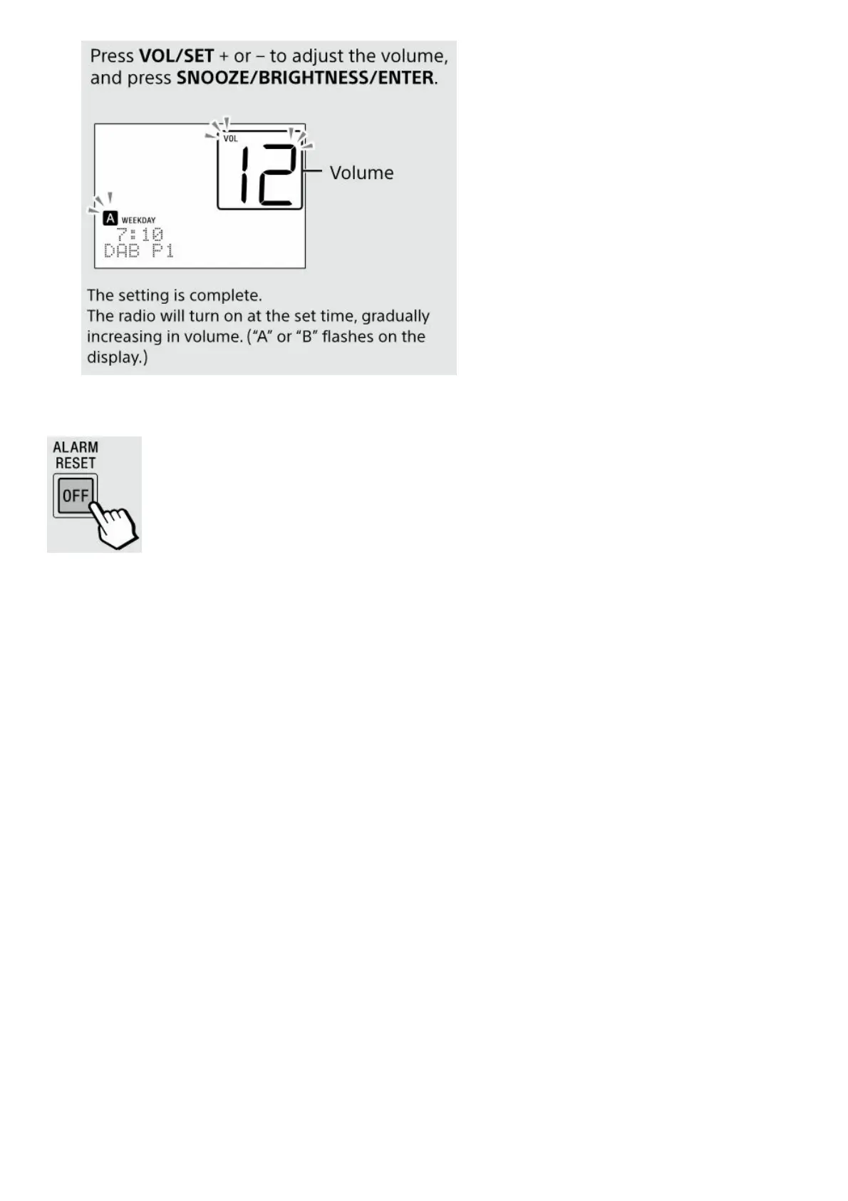 Press SET ALARM/ALARM A or B.