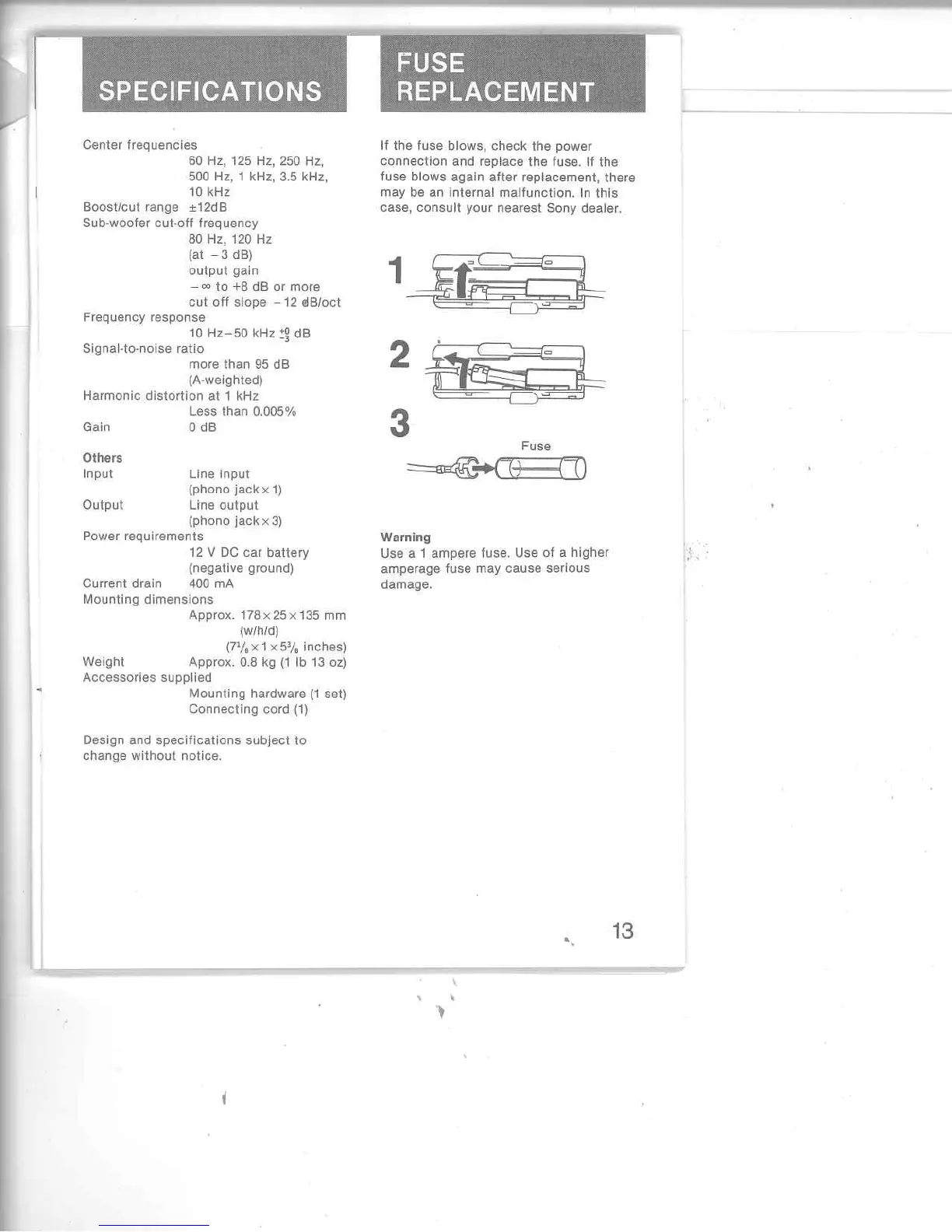 Sony XE-8 - Sony XE-8 Technical Specifications; Sony XE-8 Fuse Replacement Procedure