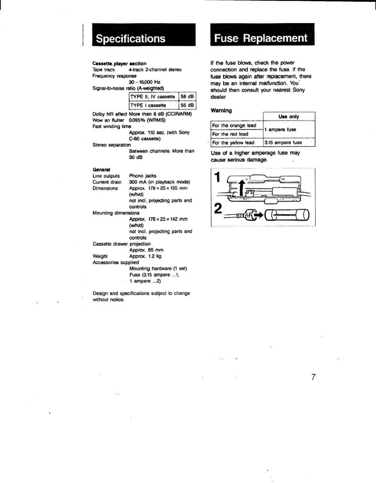 Sony XK-8D - Specifications and Fuse Replacement; Cassette Player Specifications; General Specifications; Fuse Replacement Procedure