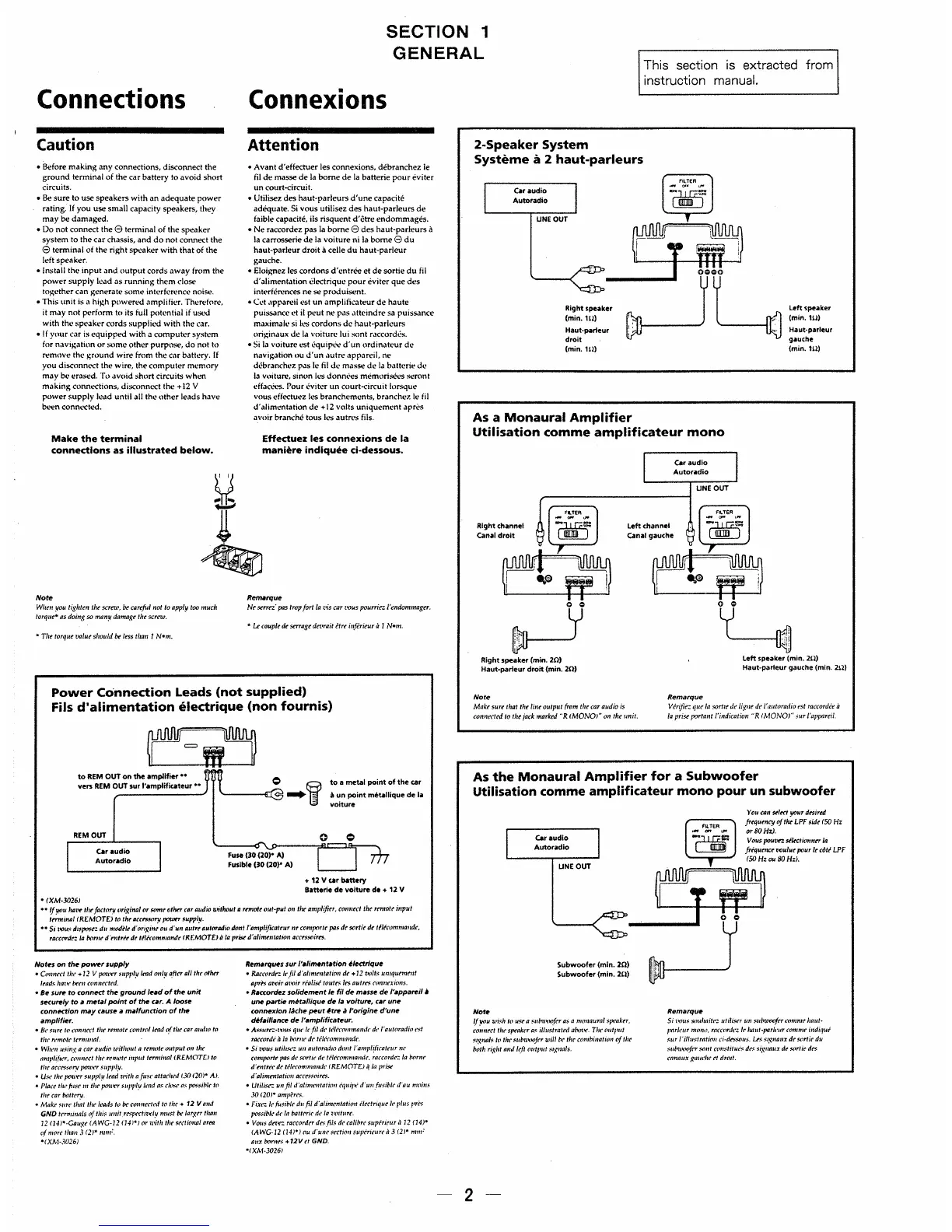 Sony XM-3026 - General; Connections; Caution; Power Connection Leads
