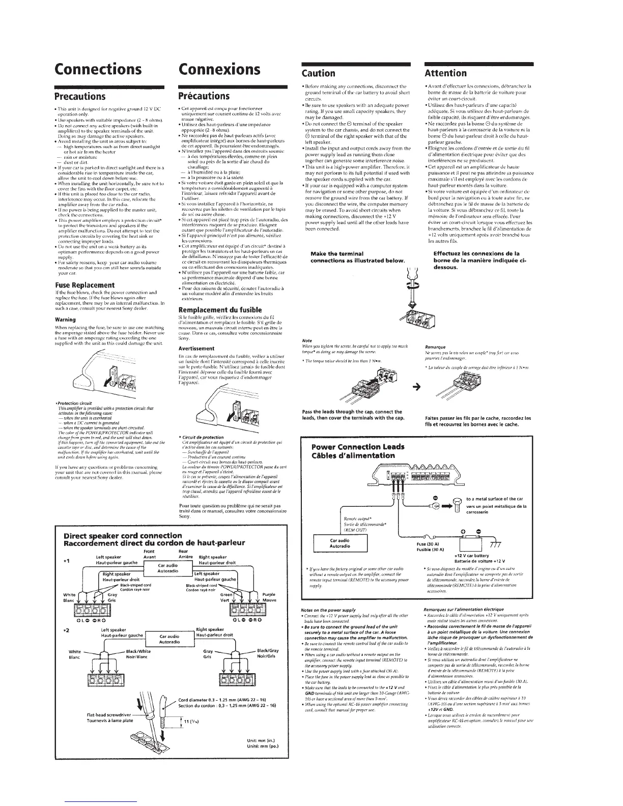 Sony XM-440EX - Connections; Precautions and Safety; Power and Speaker Connections