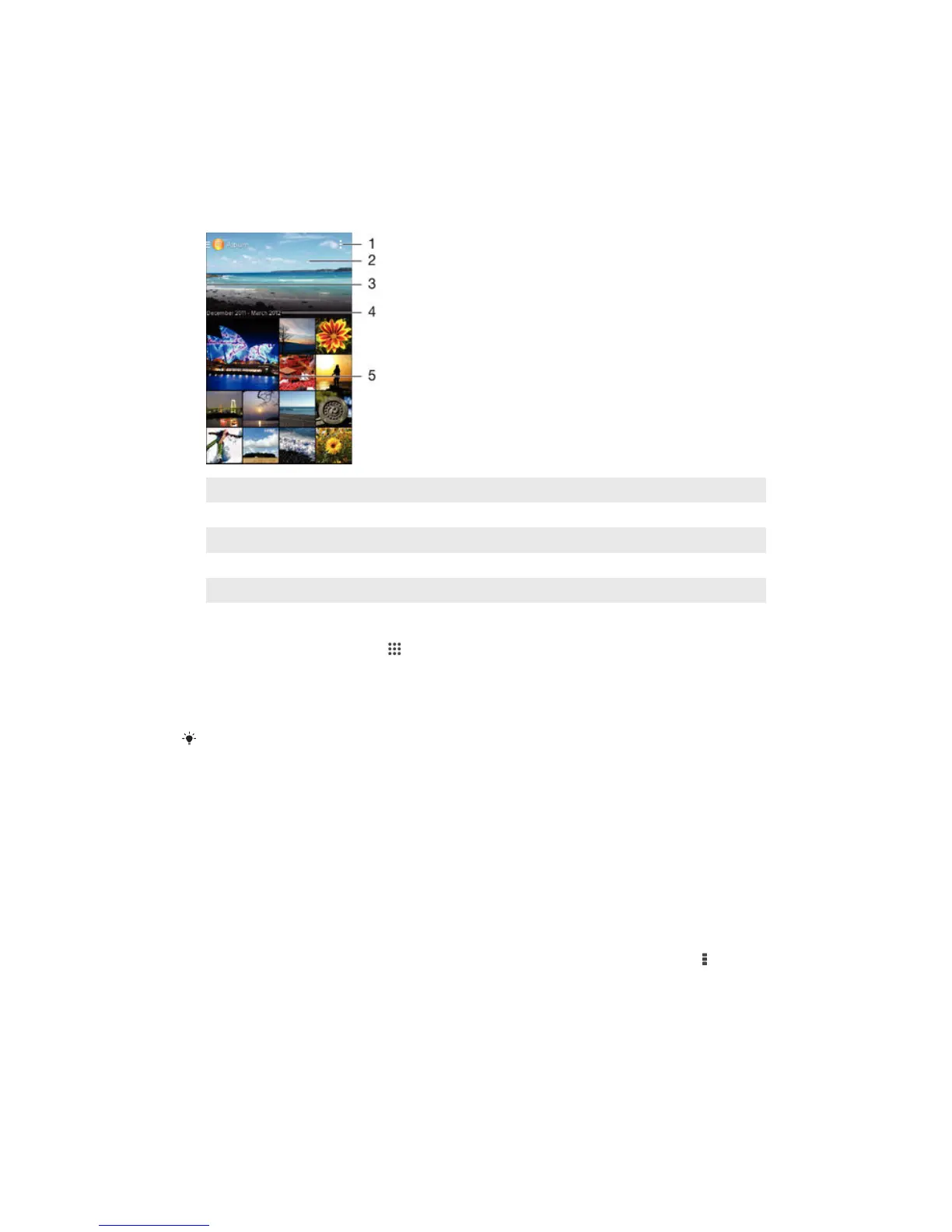 Use the Album application to view photos and play videos that you’ve taken with your