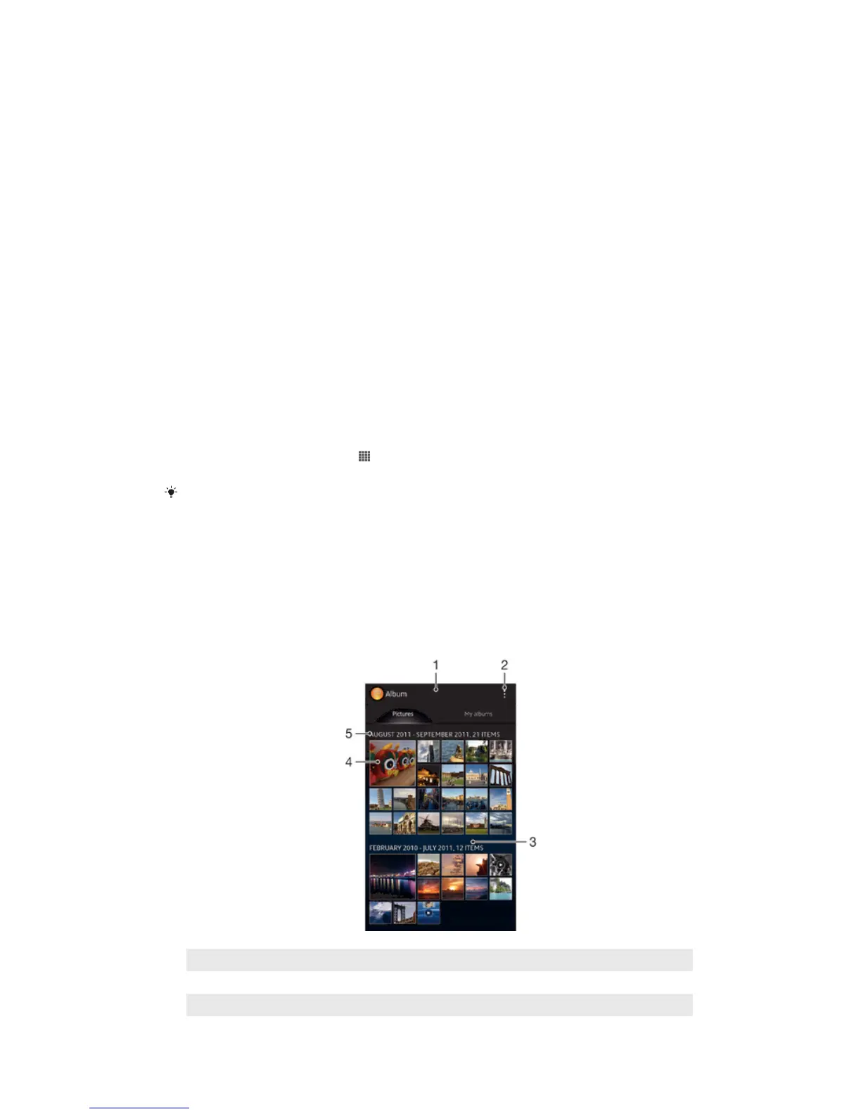 In the Pictures tab in Album, you can view your photos and videos in thumbnails in a