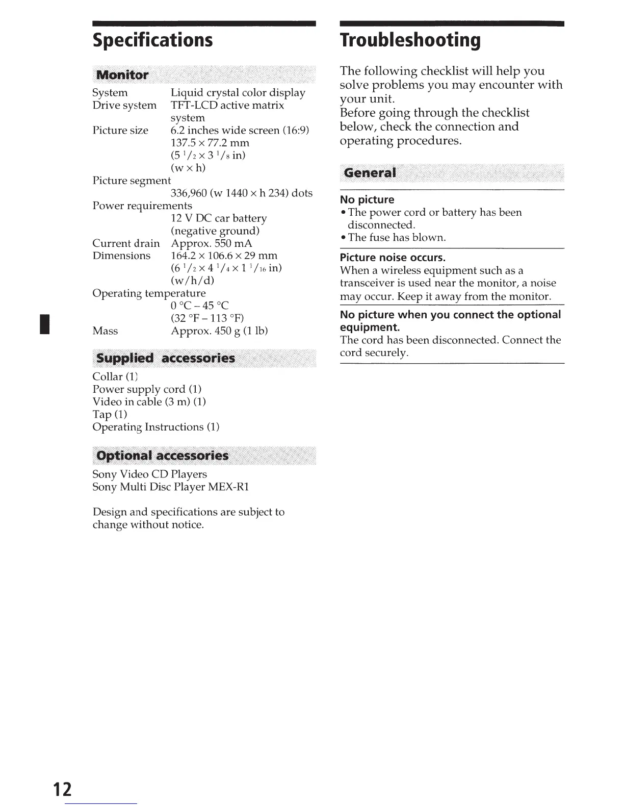 Sony XVM-862 - Specifications; Monitor Specifications; Supplied and Optional Accessories; Troubleshooting