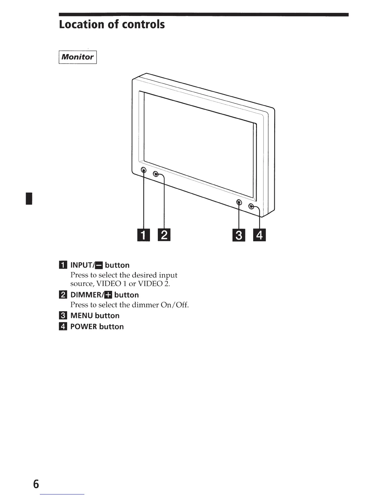 Sony XVM-862 - Monitor Control Layout; INPUT;- Button; DIMMER;+ Button; MENU Button