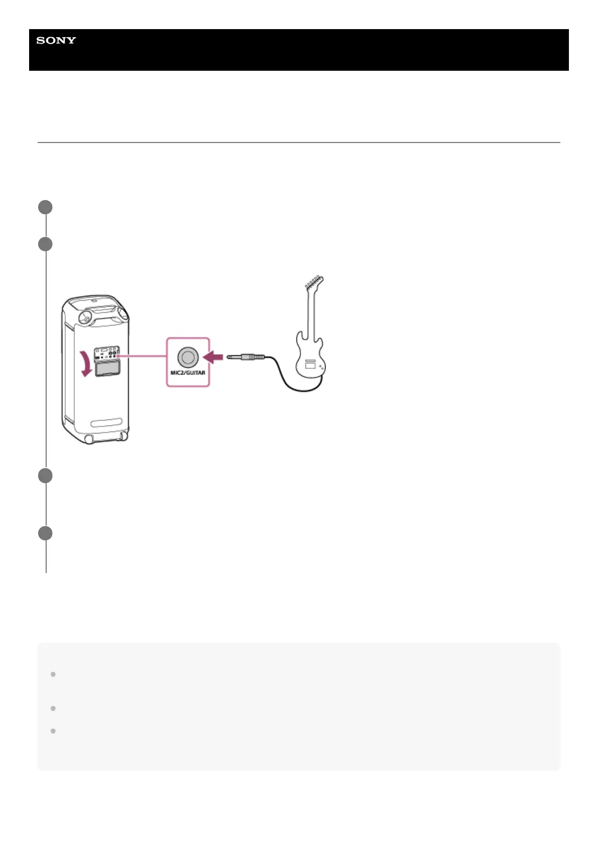 You can listen to sound from your guitar by connecting it to the MIC2/GUITAR jack (Φ 6.3 mm) on the speaker. By