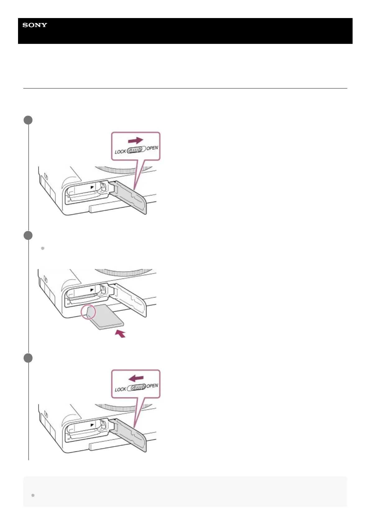Explains how to insert a memory card (sold separately) to the camera. You can use SD memory cards and Memory Stick