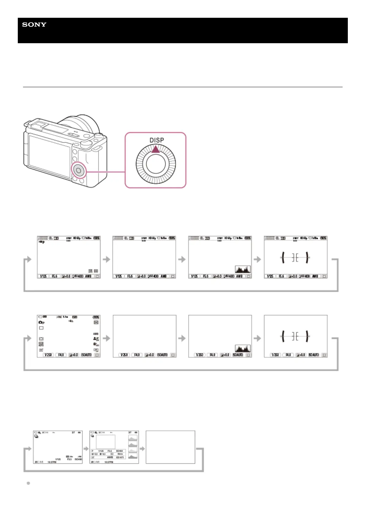 By pressing the DISP (Display Setting) button, you can change the content displayed on the screen during shooting and