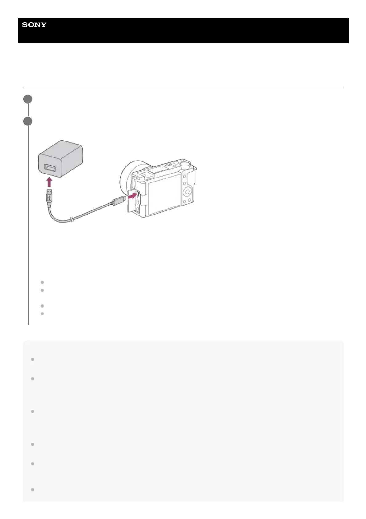 Connect the camera with the battery pack inserted to the AC Adaptor (supplied) using the USB cable, and