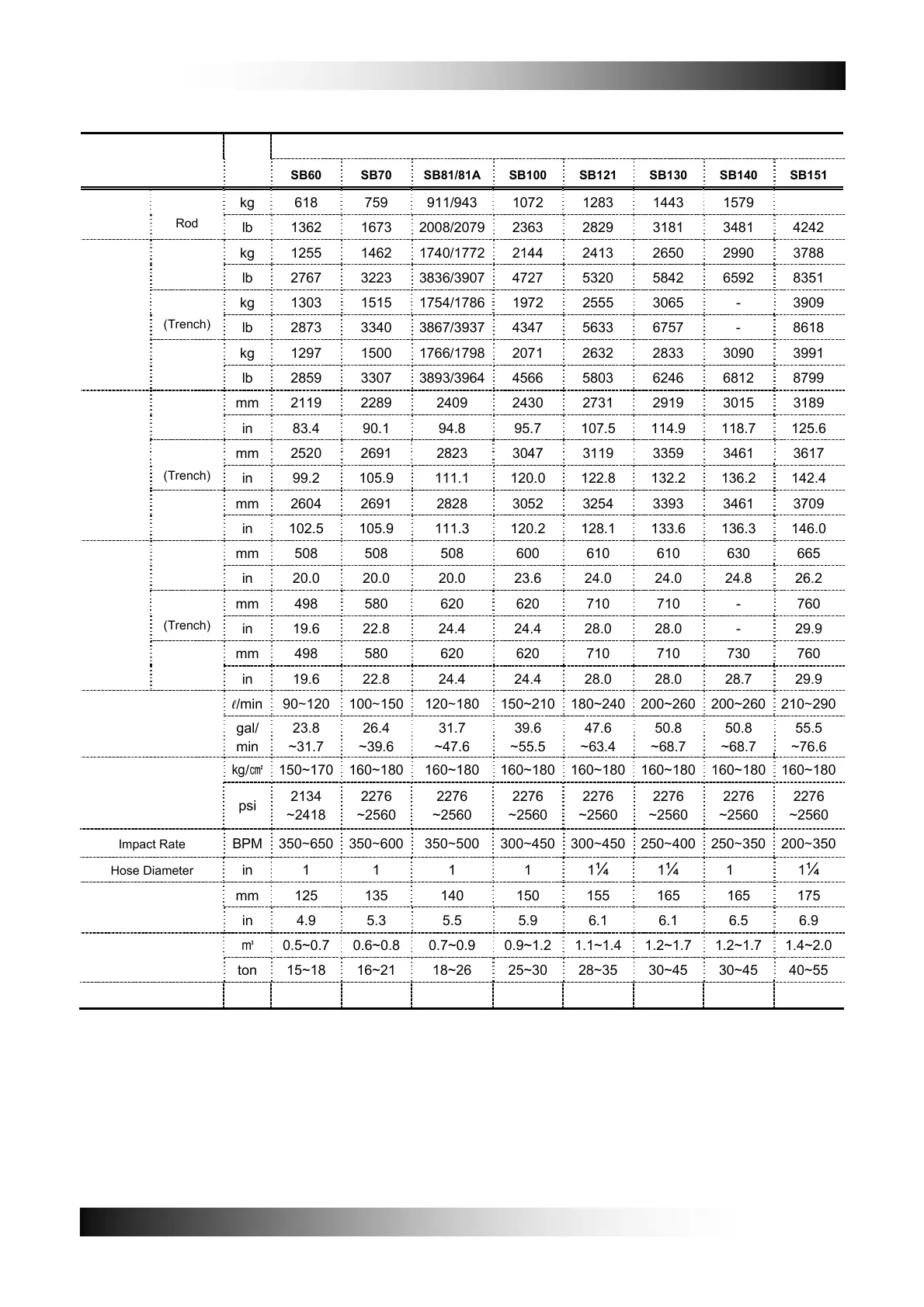 Impact Rate BPM 350∼650 350∼600 350∼500 300∼450 300∼450 250∼400 250∼350 200∼350