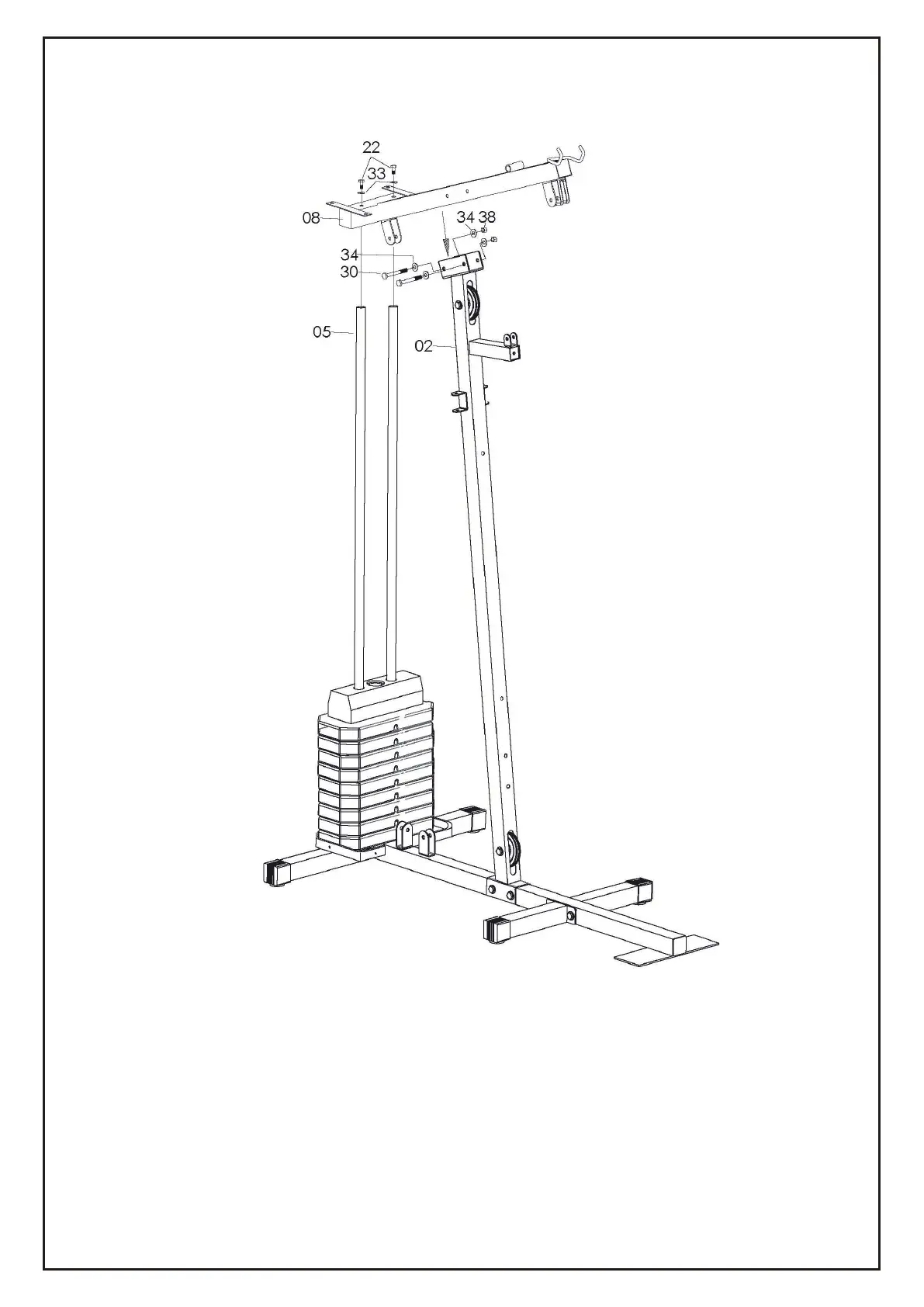 2) Attach the Bridge Tube (08) to the Upright Support Tube (02) and tighten by X2 Hex