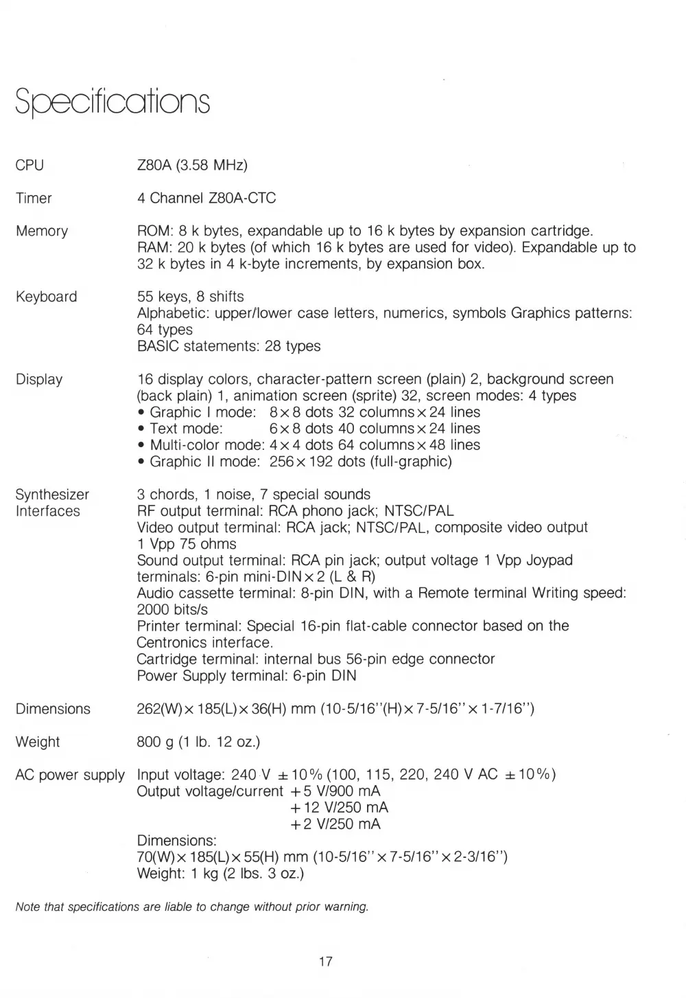 • Graphic II mode: 256 x 192 dots (full-graphic)
