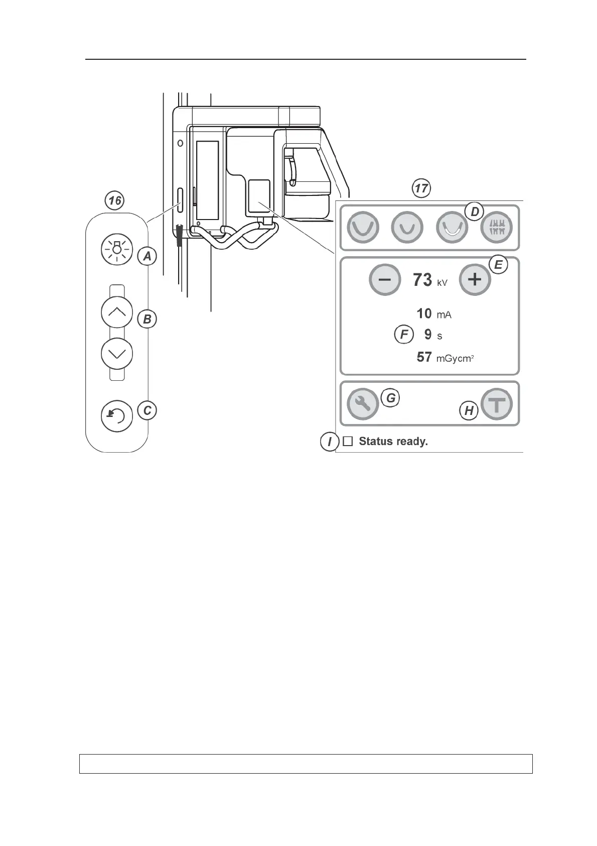 C Return key, drives rotating unit to the patient in/out position (PIO)