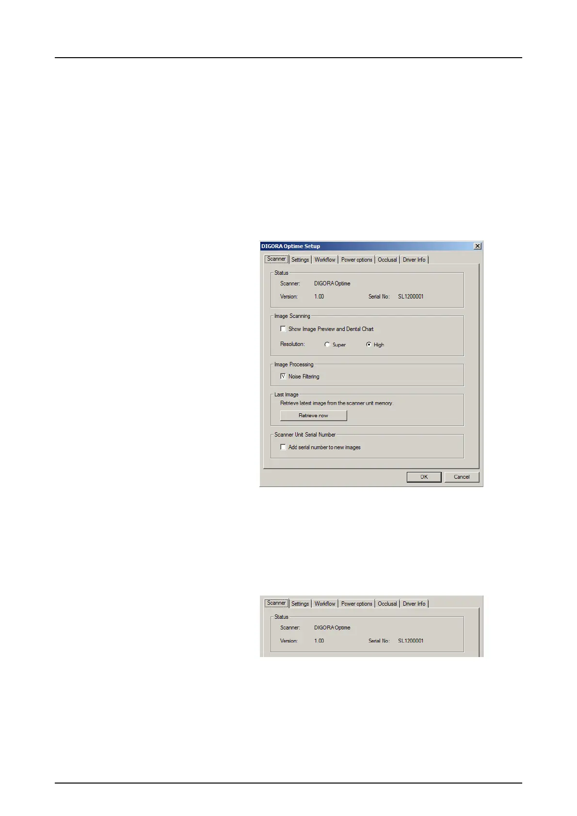 Shows the scanner type, firmware version and unit serial