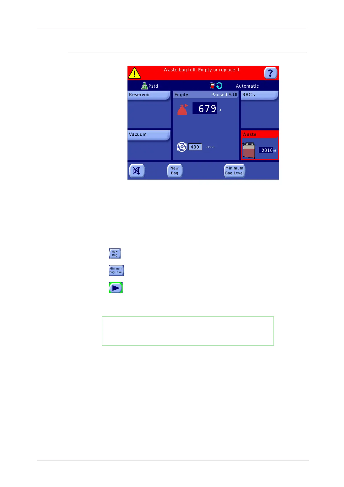Do not empty below the minimum level. Touch the “Minimum Bag Level” button to resume.
