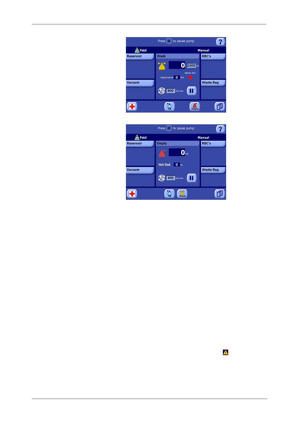 the Ready Screen and the text “RBC detector disabled. Press Wash manually.” during the Fill