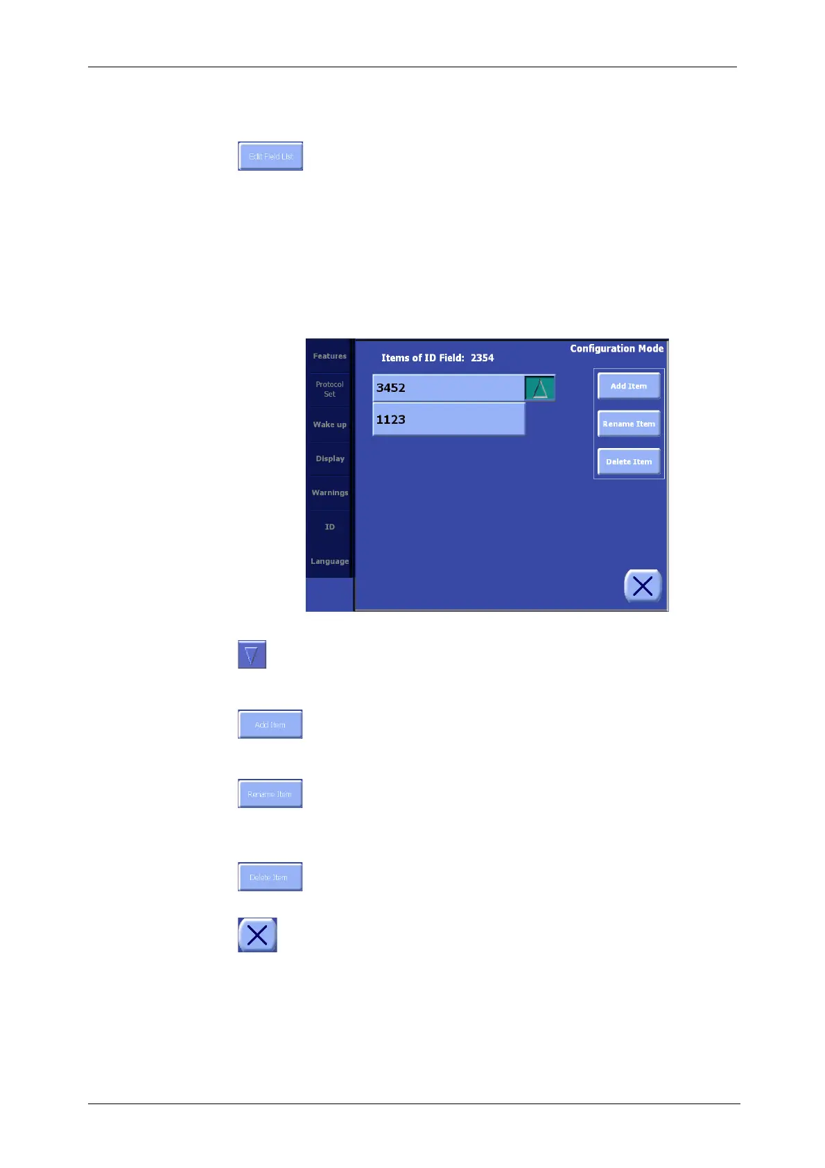 Touching the Close button will close the Edit Field List Screen and return to the ID Tab of the