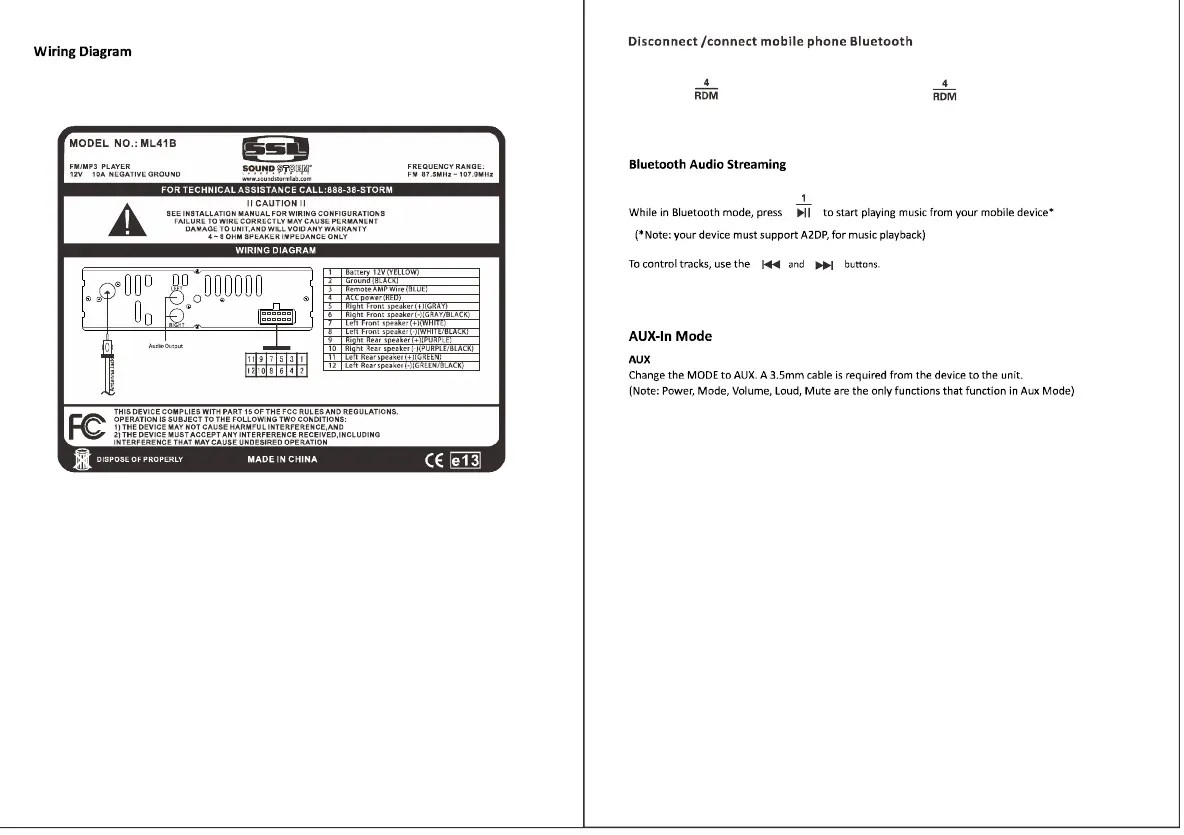 Sound Storm ML41B - Wiring Diagram; Bluetooth and AUX Operations; Bluetooth Audio Streaming; AUX-In Mode