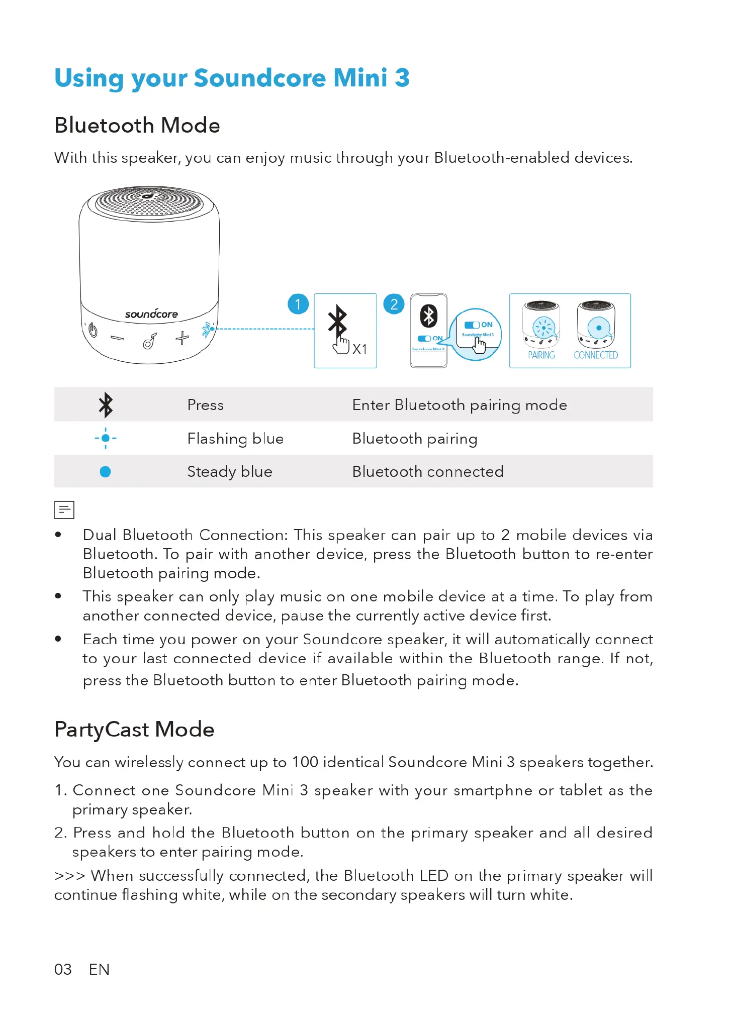 Soundcore Mini 3 - Using your Soundcore Mini 3; Bluetooth Mode; PartyCast Mode