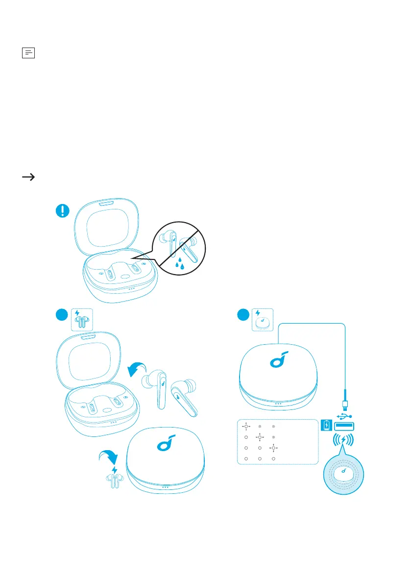 • Przed ładowaniem dokładnie wyczyść słuchawki douszne i port USB.