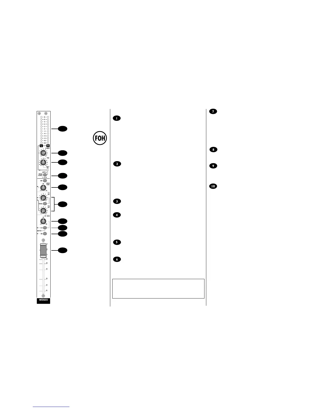 The 100mm fader controls the overall level of the wedges output. The 0