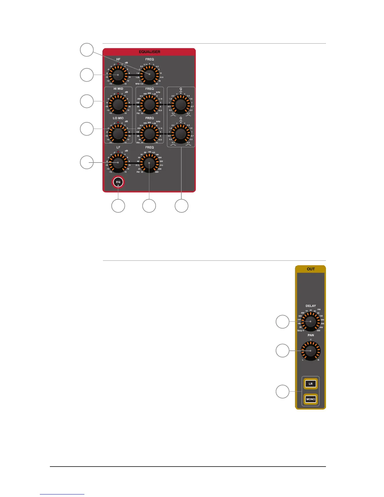 3. LR & MONO keys: toggles the routing of the channel or bus