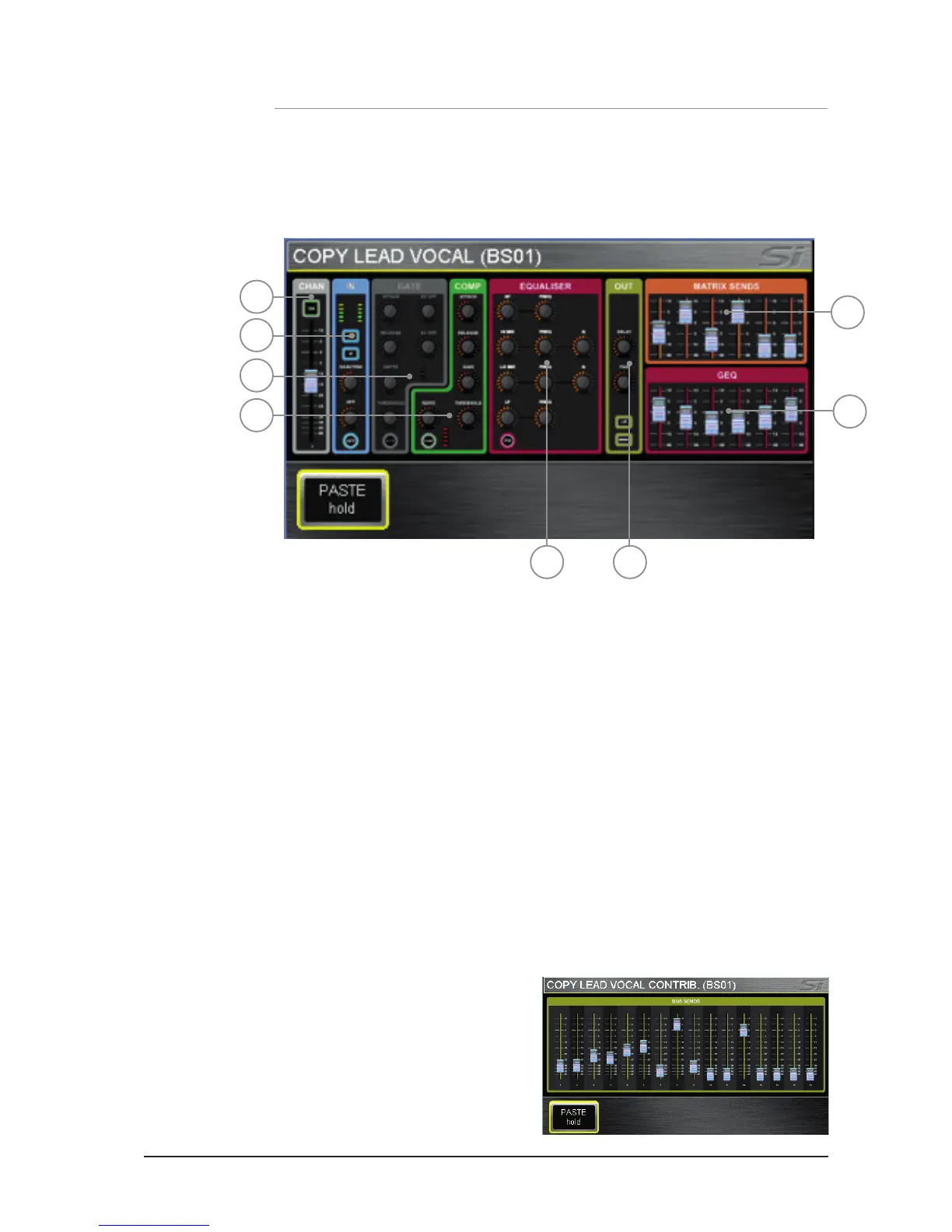 To paste the clipboard contents to another channel or bus press and hold the PASTE button