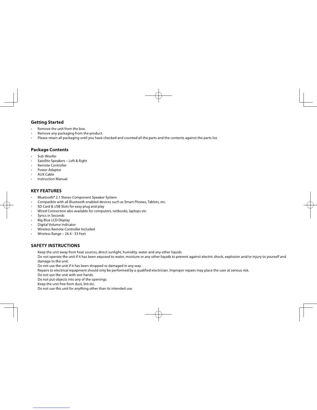 SoundLogic XT BCS-2/5711 - Getting Started; Package Contents; Key Features; Safety Instructions