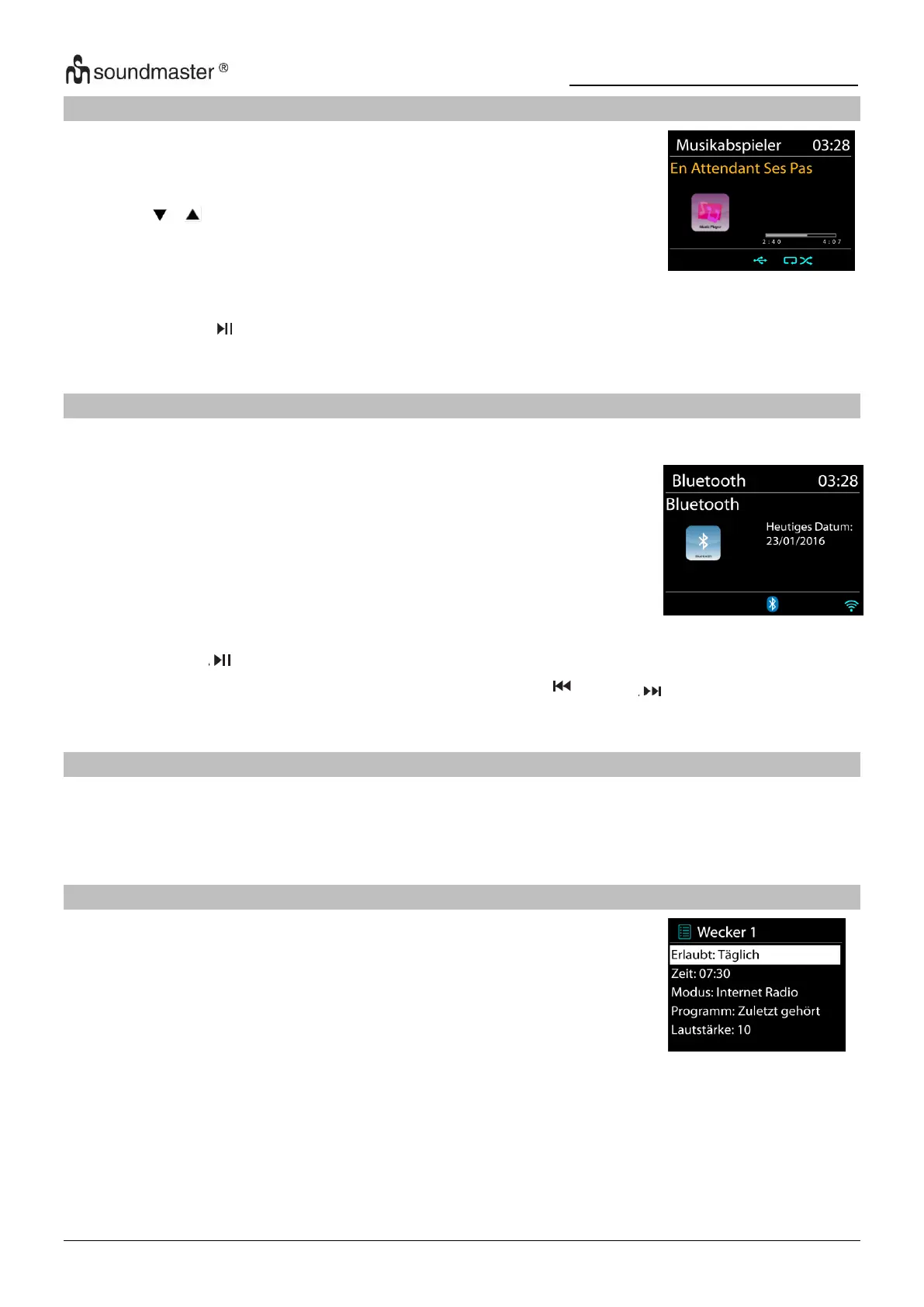Drücken Sie die „ “ Taste am Gerät oder auf der Fernbedienung um die Musikwiedergabe zu