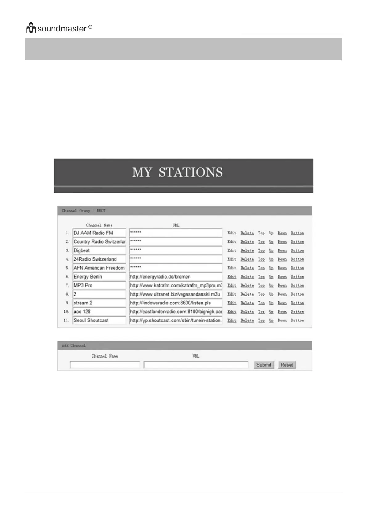 ➢ Do sekce Add channel můžete zadat název a adresu URL nové rozhlasové stanice a