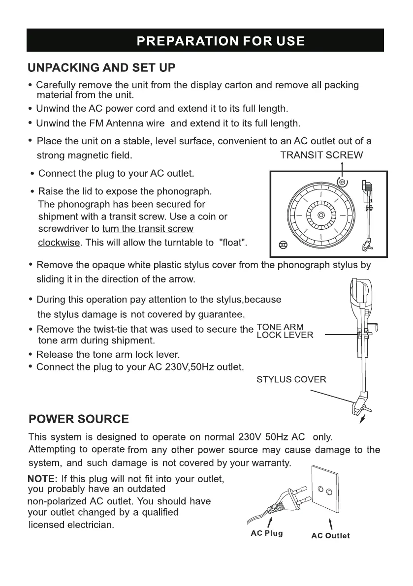 SOUNDMASTER NR515 - Preparation for Use; Unpacking and Set Up; Power Source