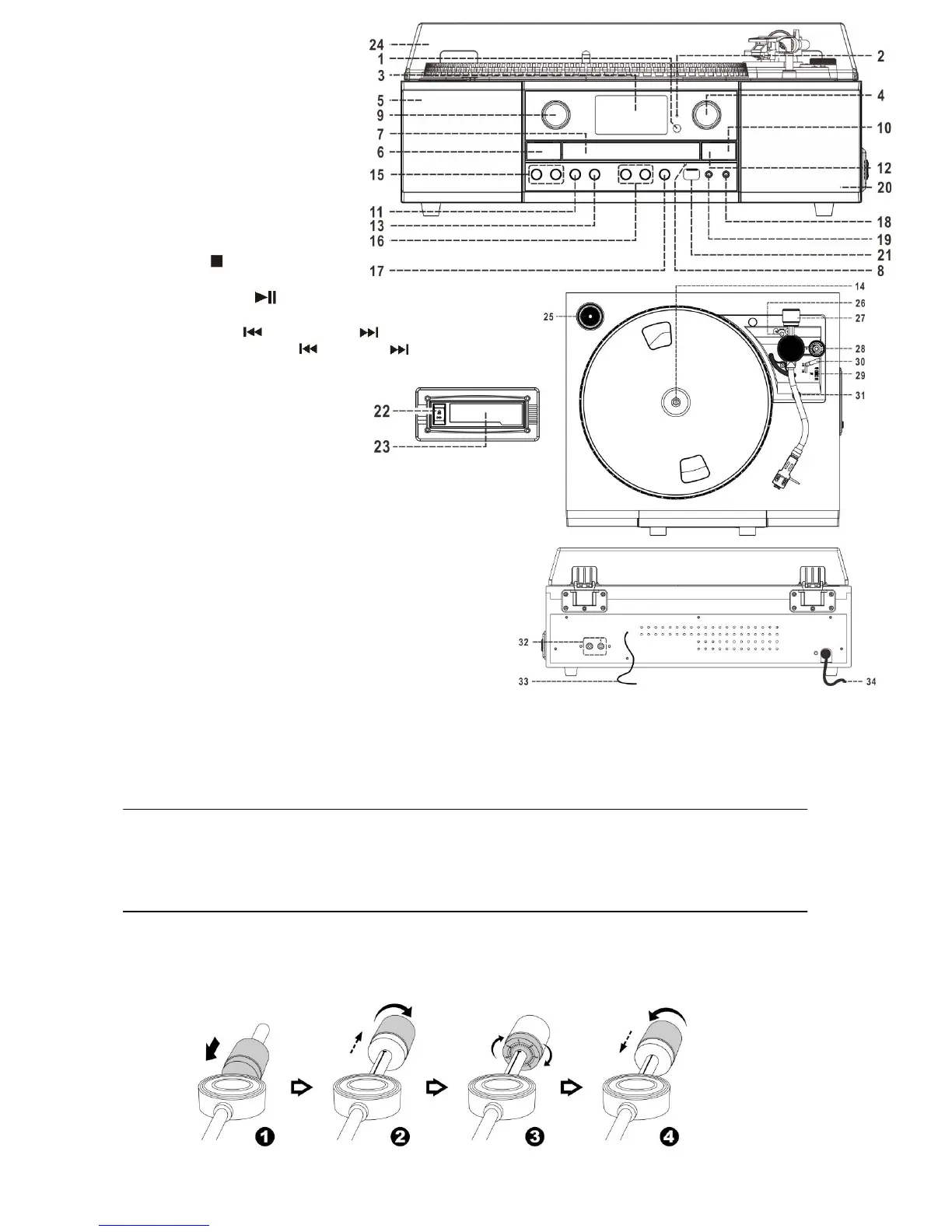 1. Slide in the counter weight completely into the rear of the tone arm until it reach the end, turn it clockwise until it click with