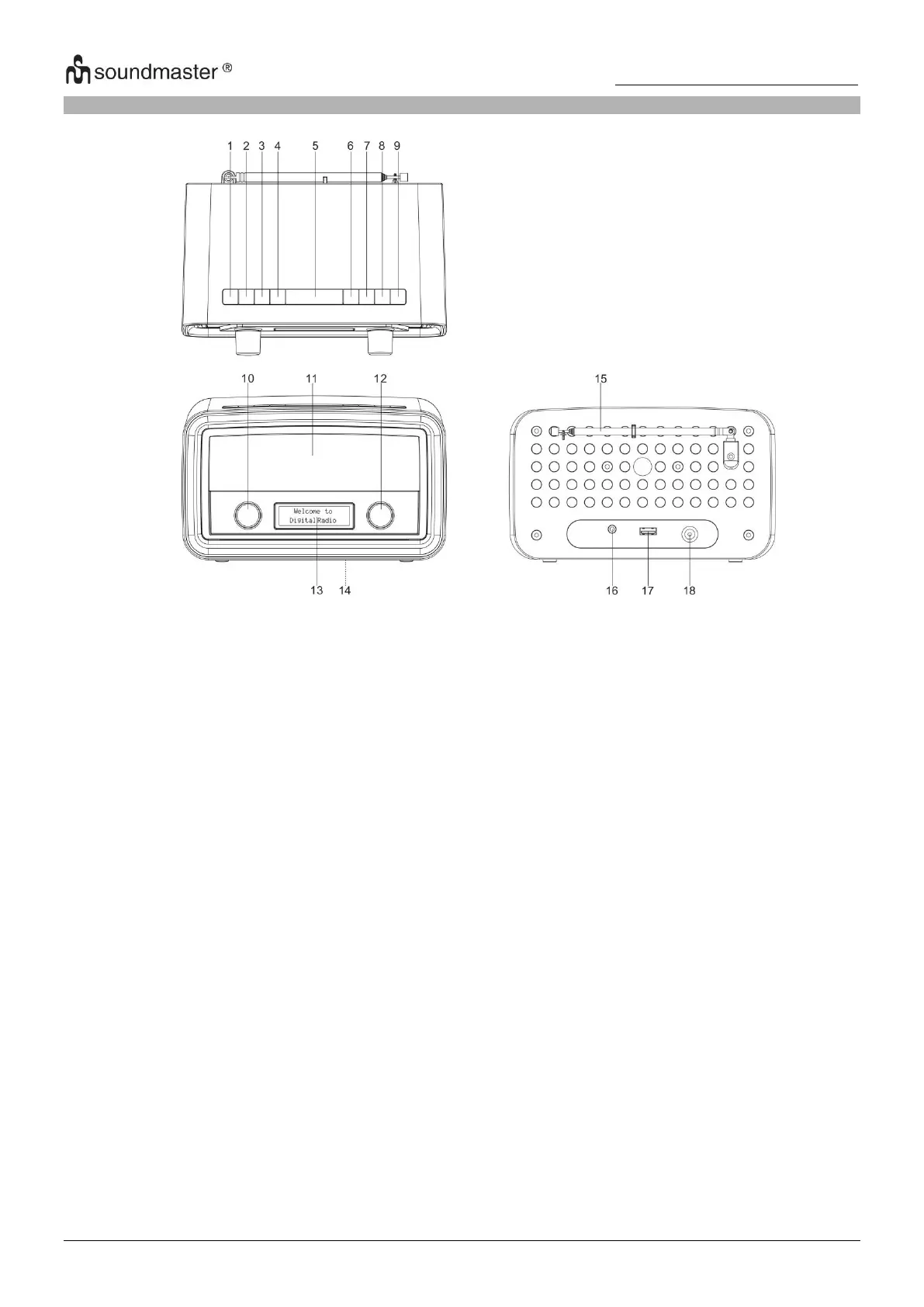 12. SELECT: In DAB mode, rotate to select a DAB station. In FM mode, rotate to tune FM
