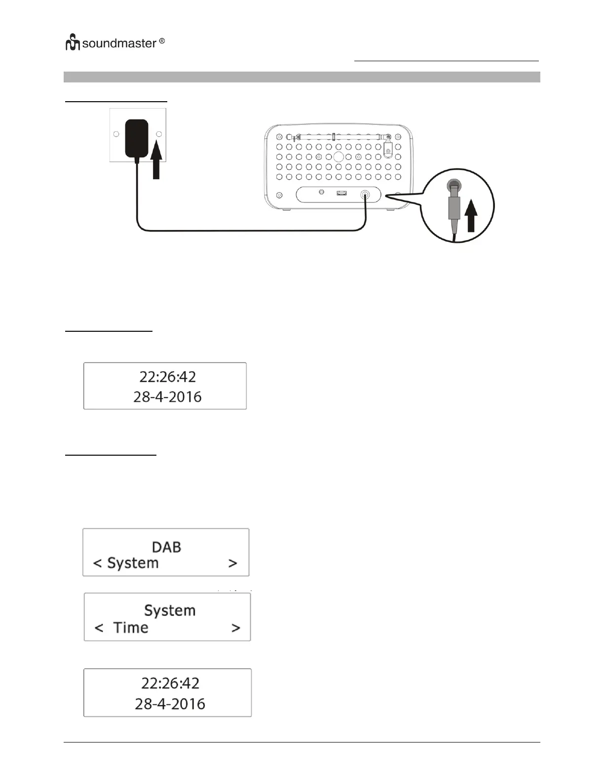 2. Branchez le cordon de l’adaptateur d’alimentation sur la prise « DC IN » de la radio.