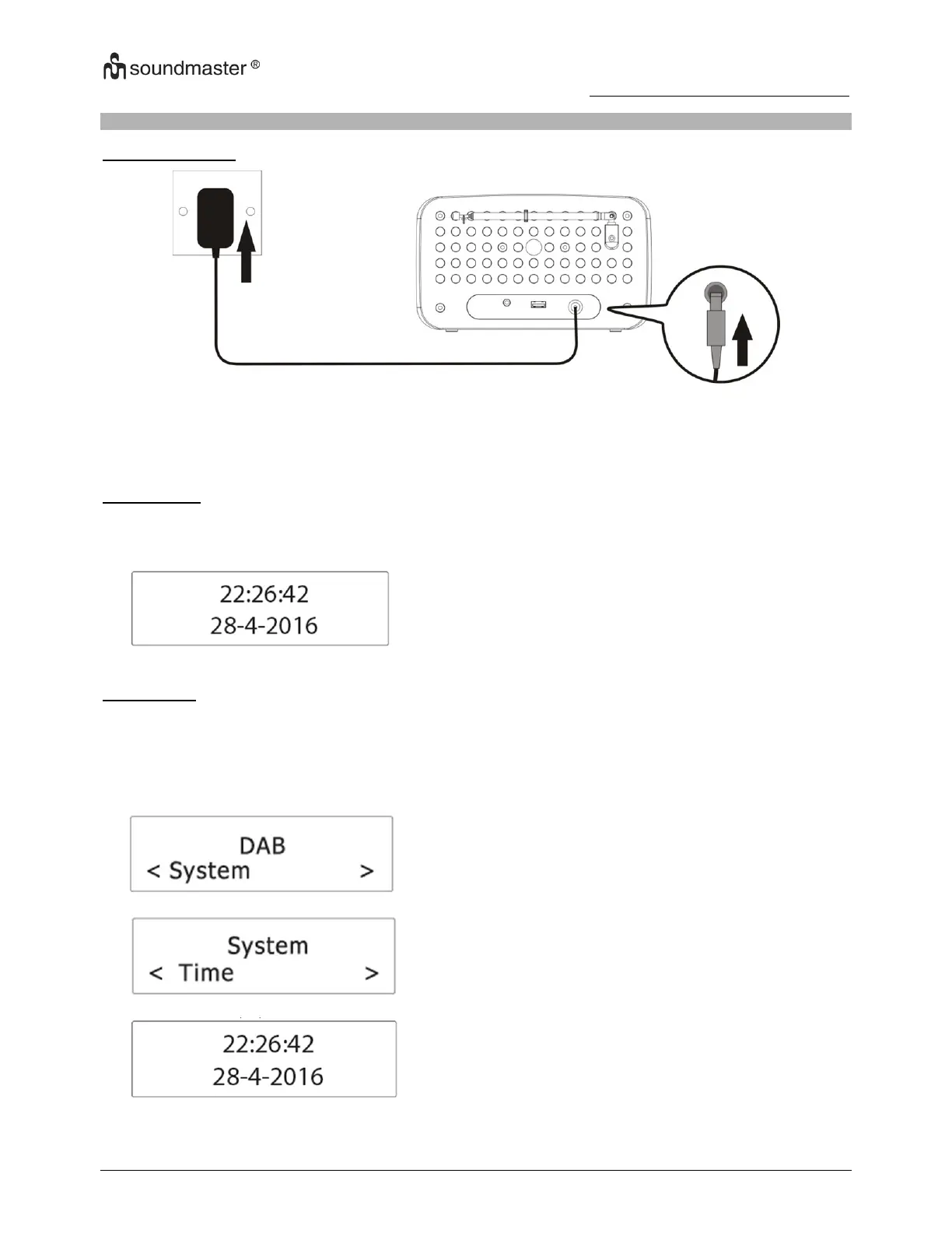 2. Koble kabelen til strømadapteren til «“DC IN»-kontakten til radioen.