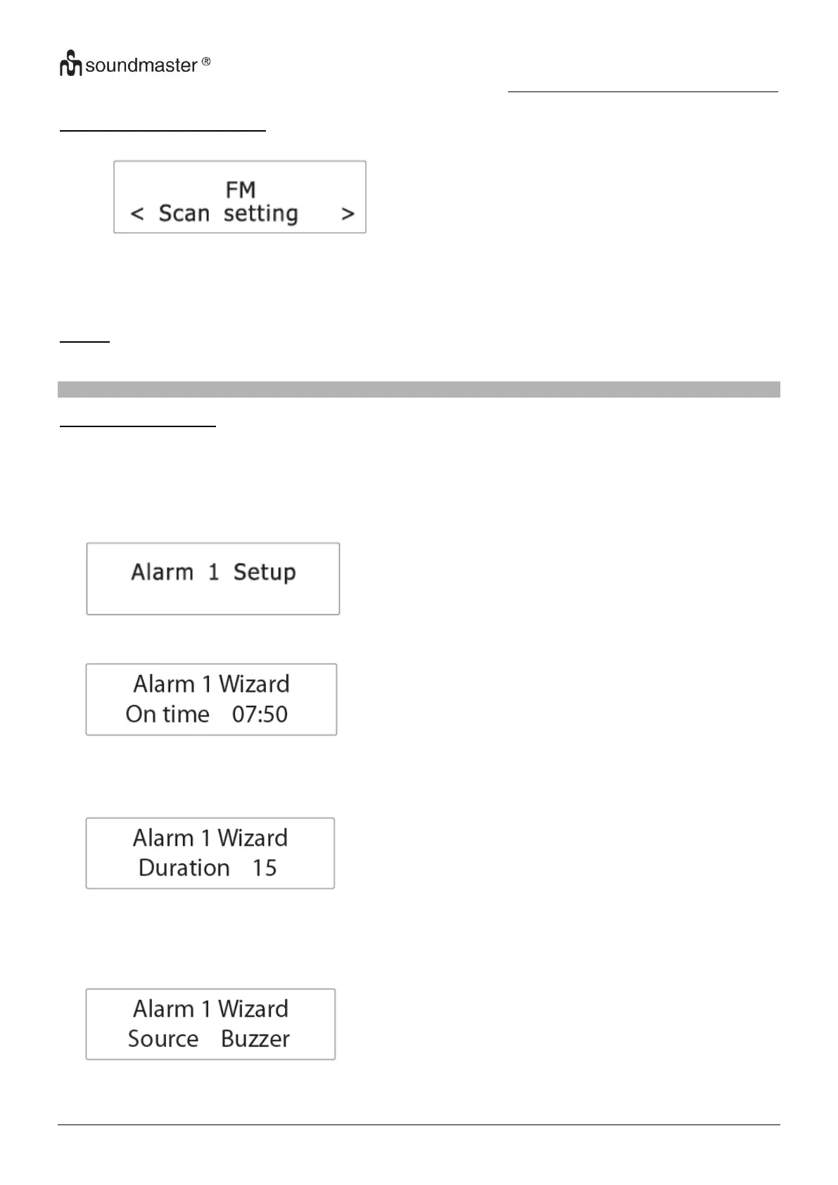 Optionen für die Quelle sind: „DAB“, „FM“ und „Buzzer“ (Weckton).