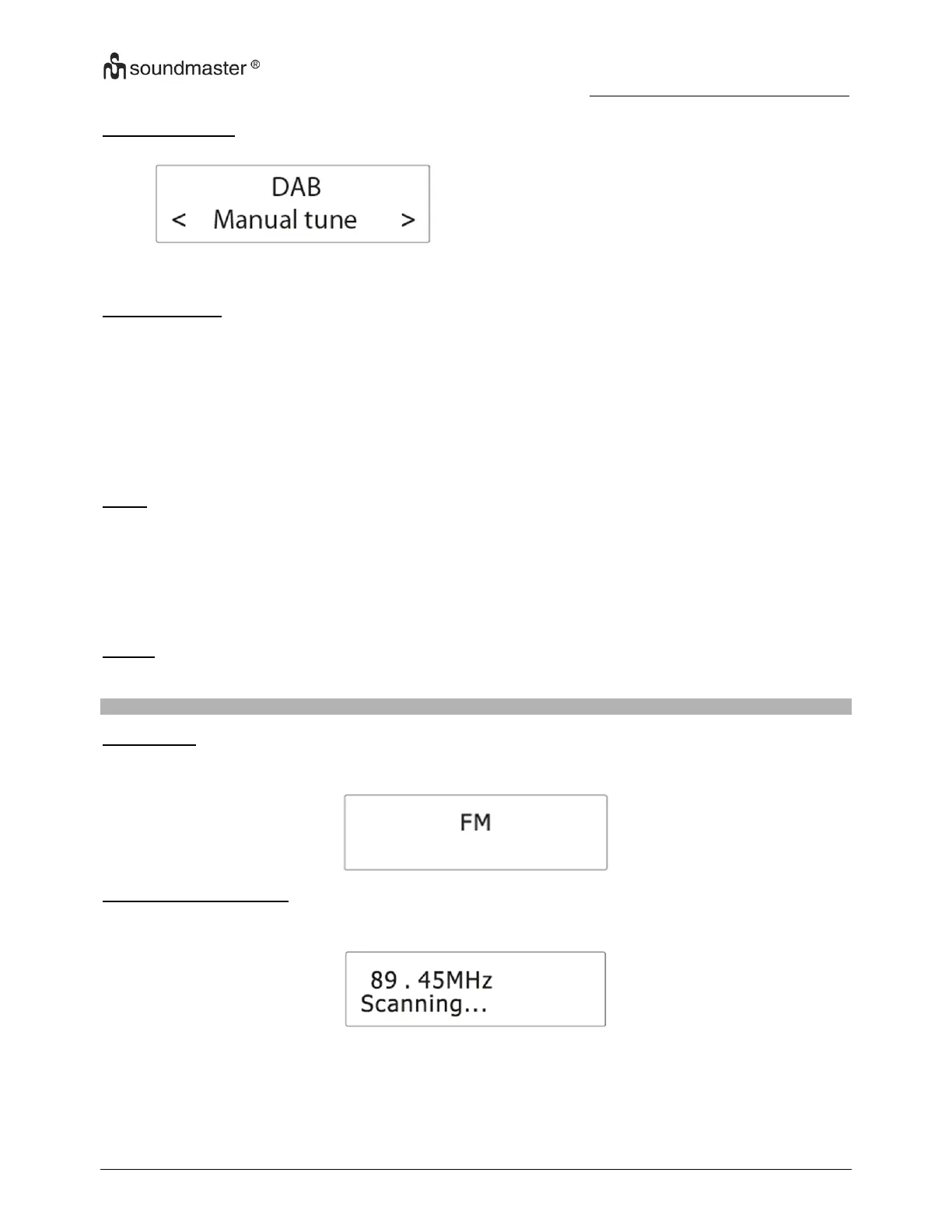 I FM-läge, tryck på ”SCAN” (9) eller ”SELECT” (12) för att starta automatisk sökning efter nästa