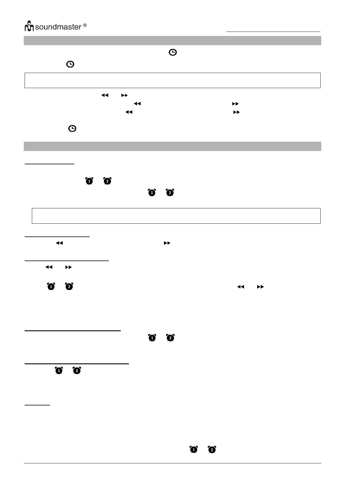 The clock lets you have 2 alarm settings. To set the alarms: