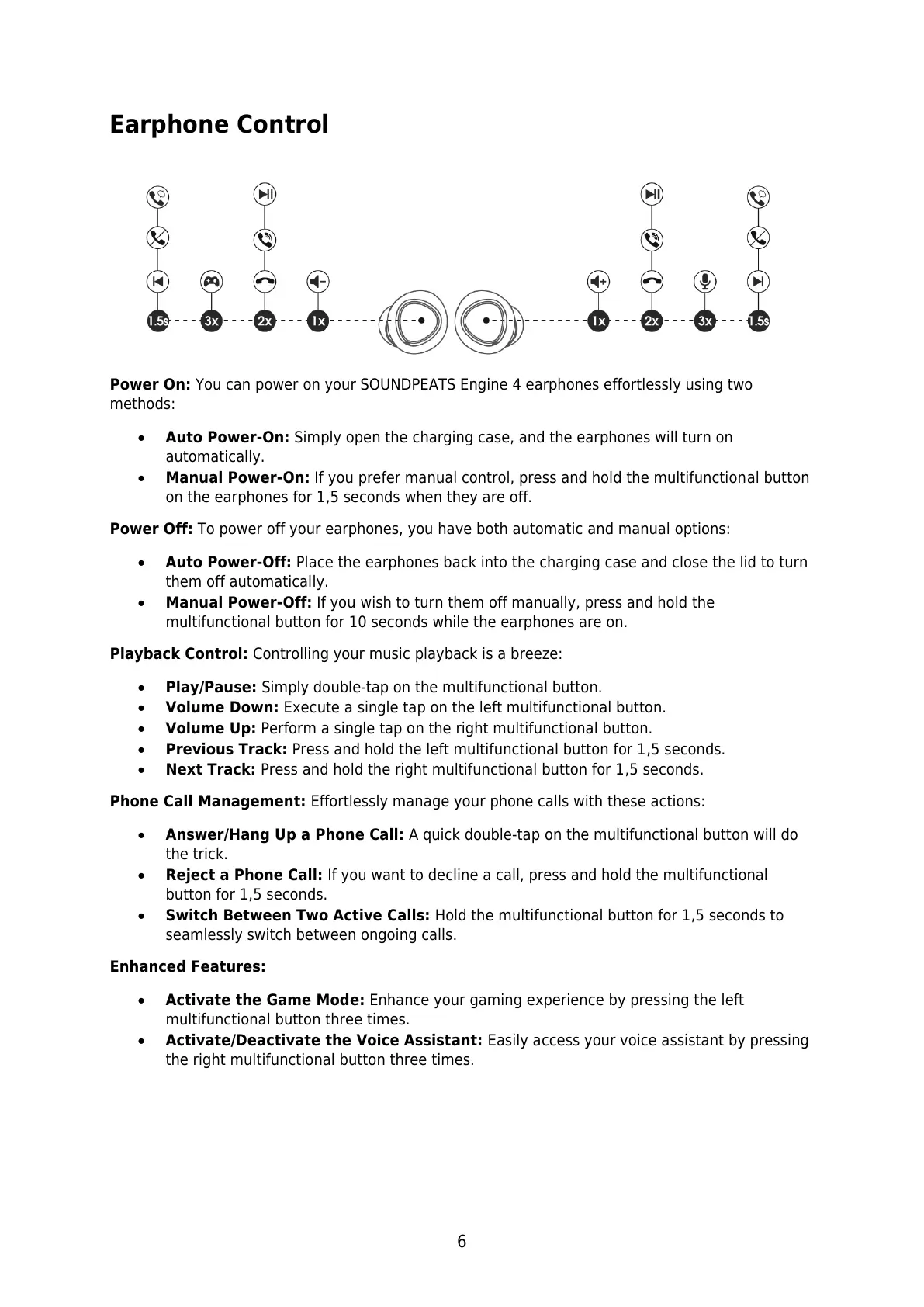 Power On: You can power on your SOUNDPEATS Engine 4 earphones effortlessly using two