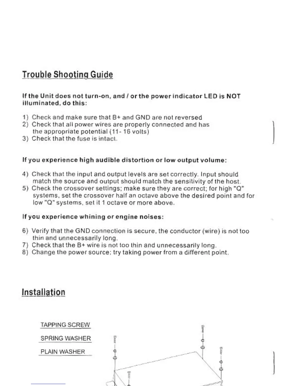 Soundstream BX-10 - Trouble Shooting Guide; Power Indicator Issues; Audio Distortion and Low Output; Whining and Engine Noises